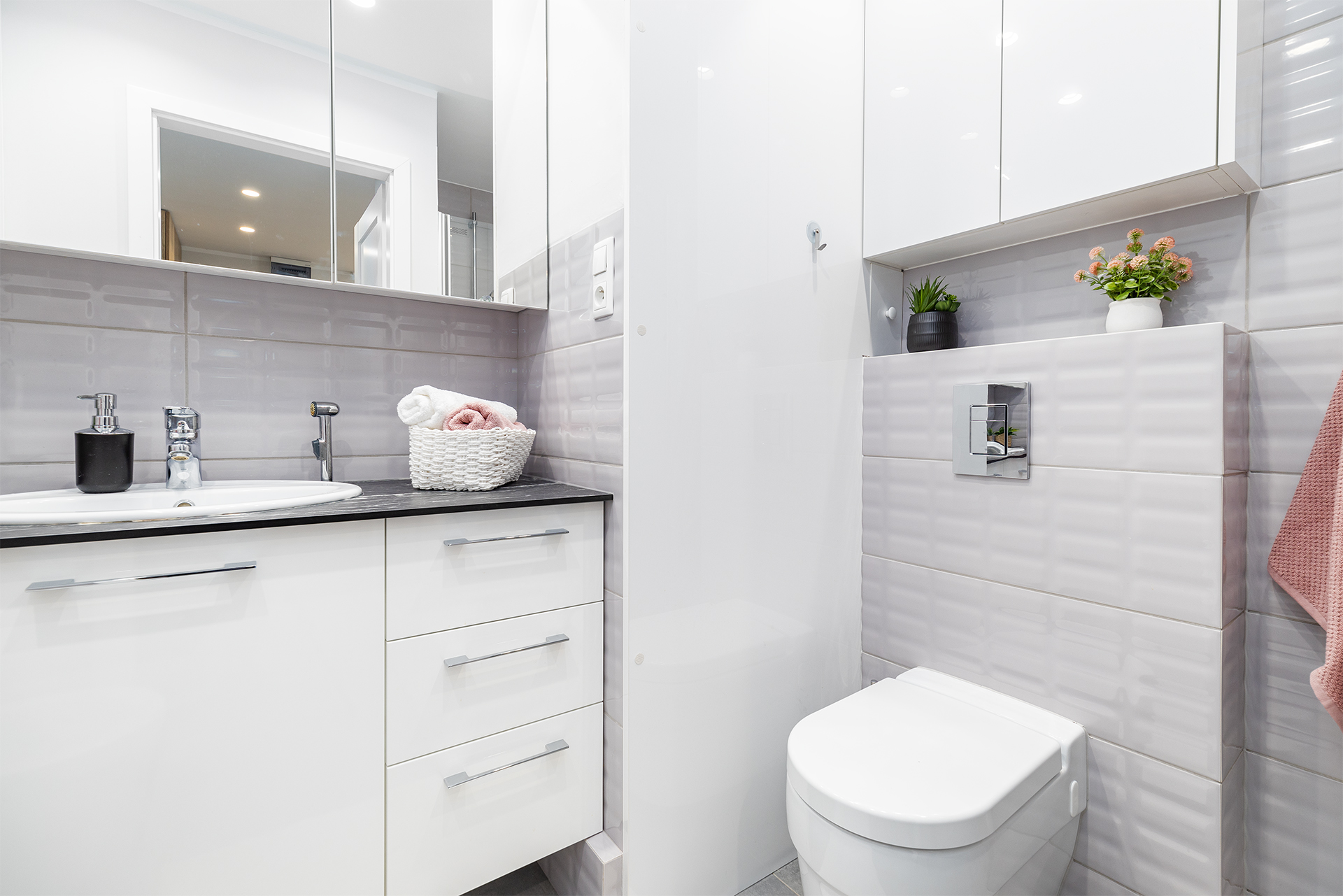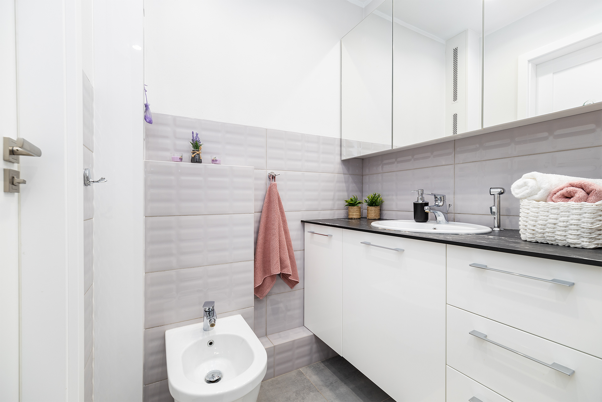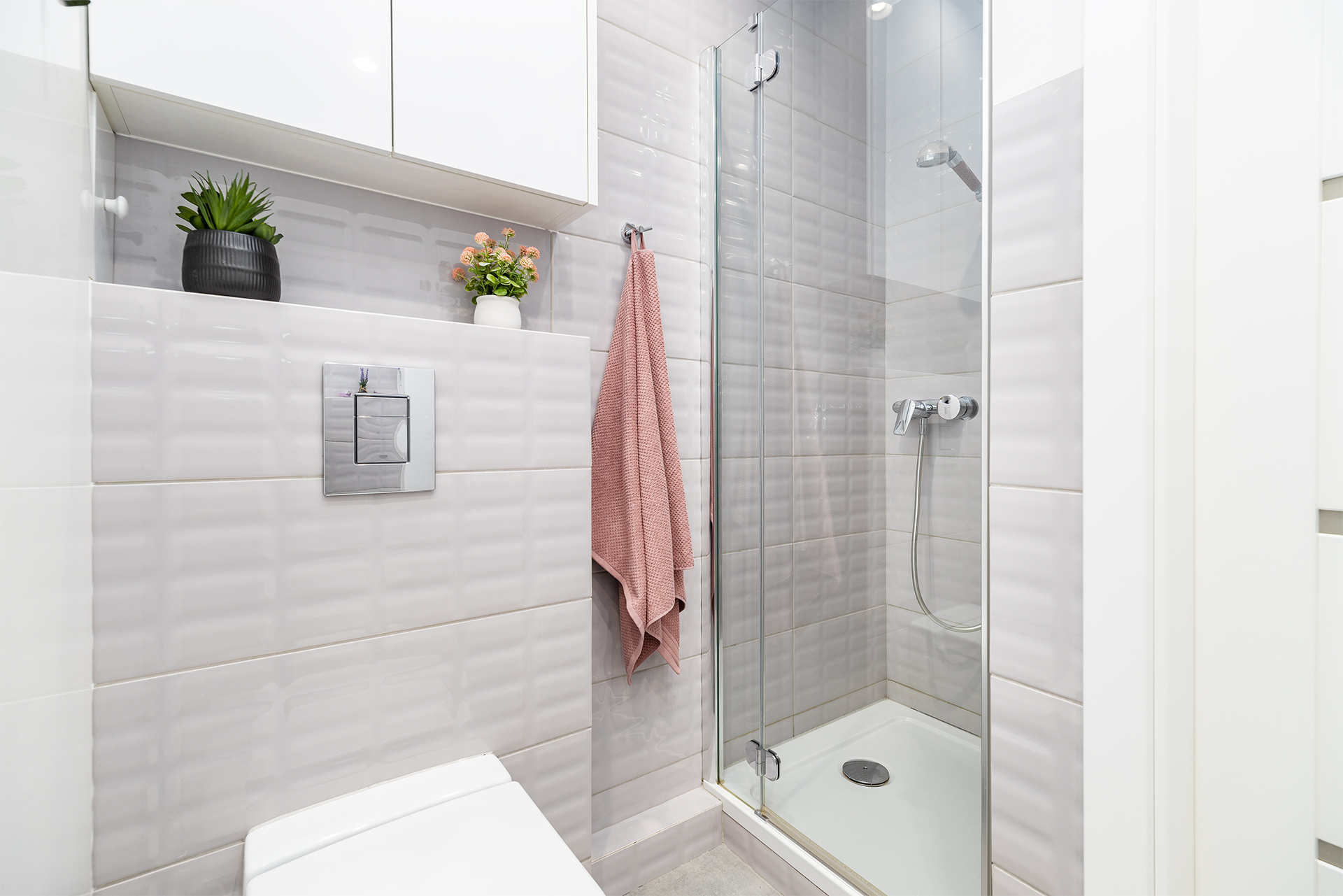 -Łazienka z kabiną prysznicową, meblami w zabudowie oraz bidetem.