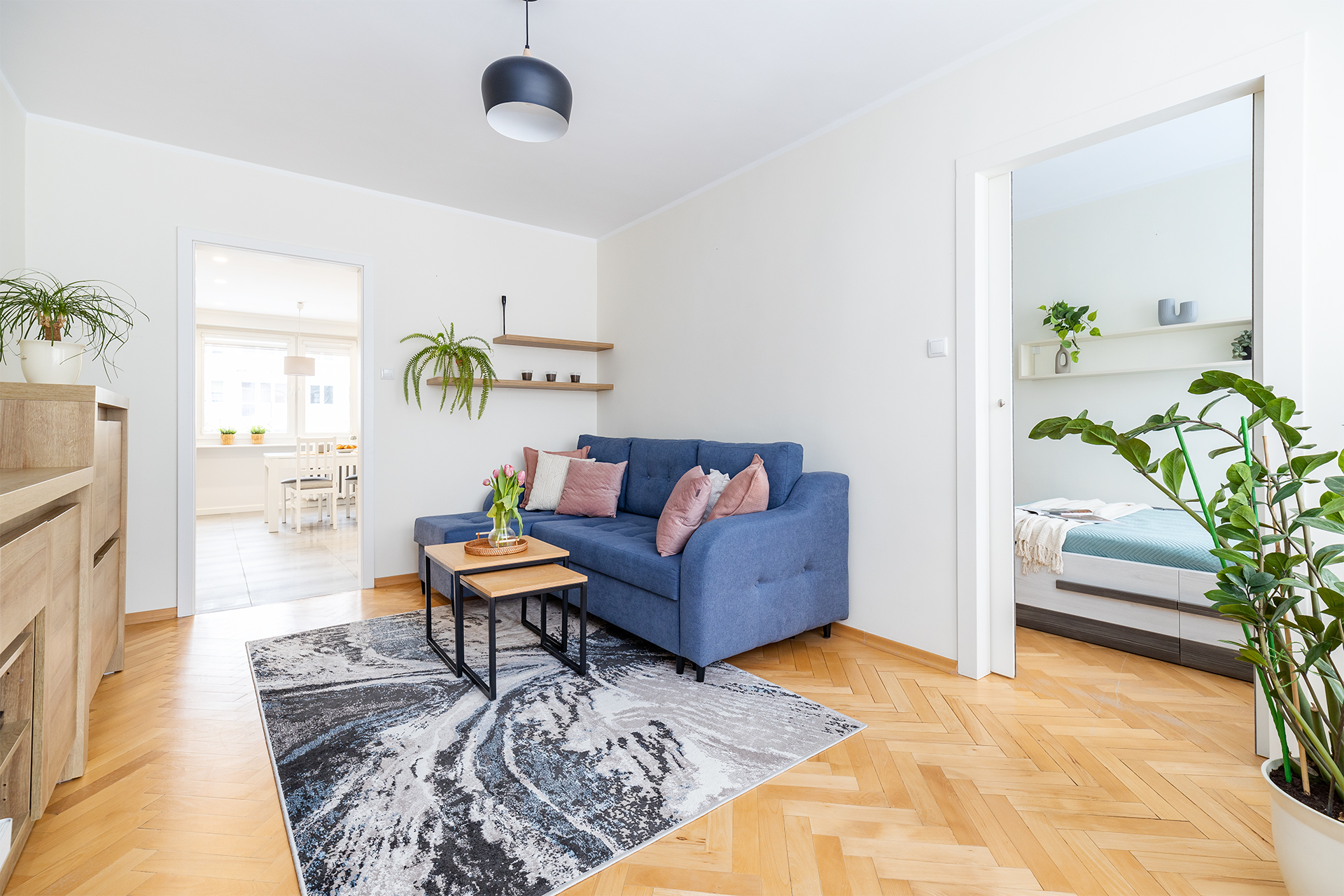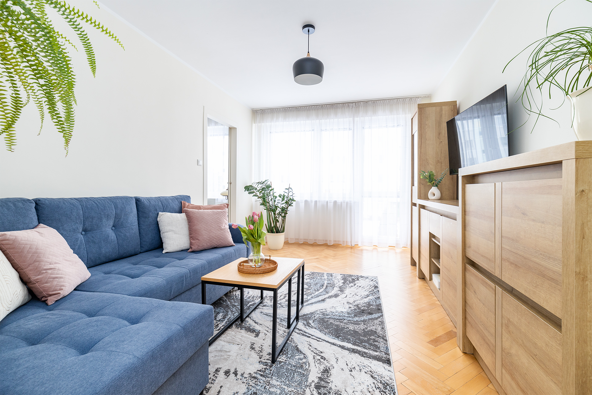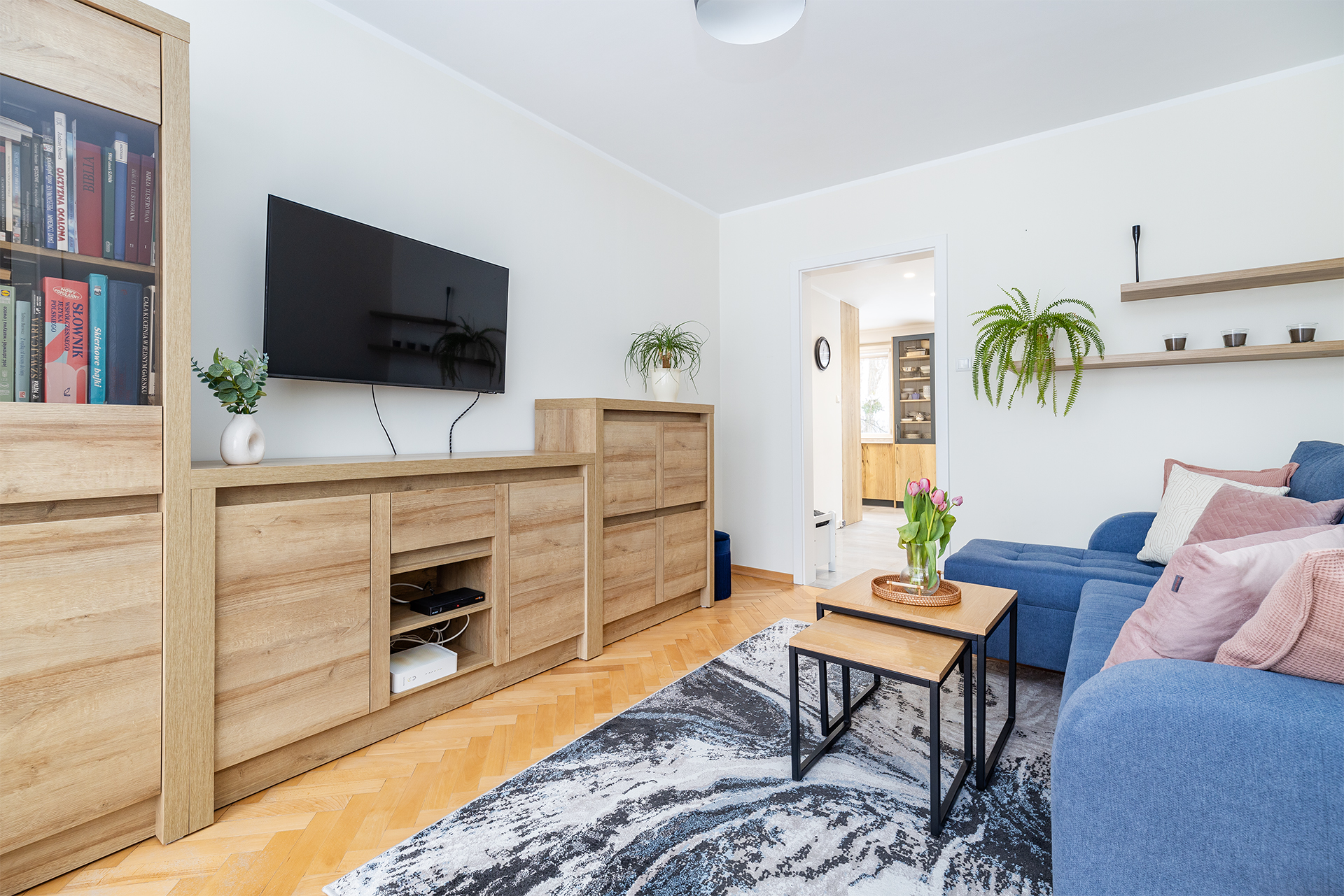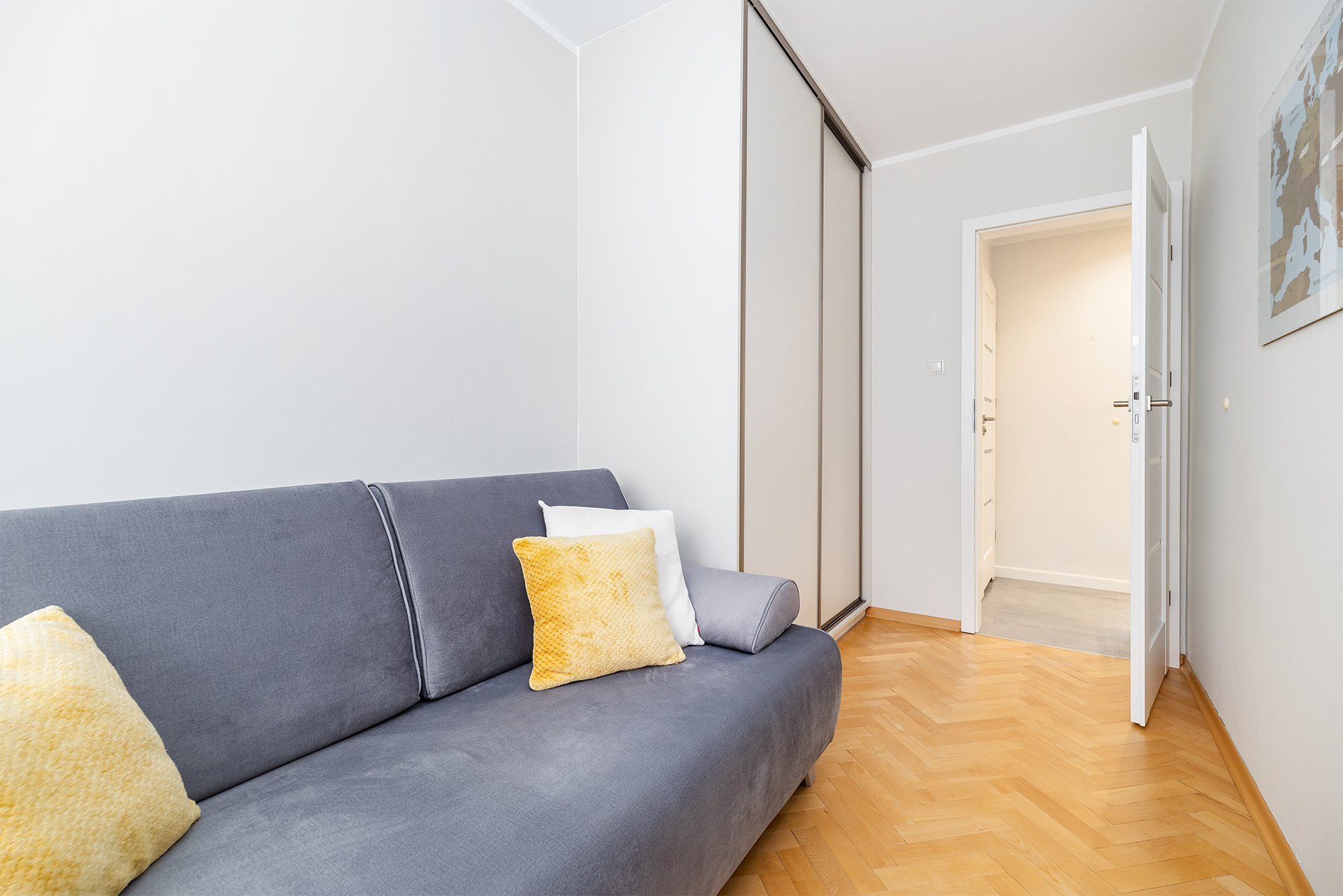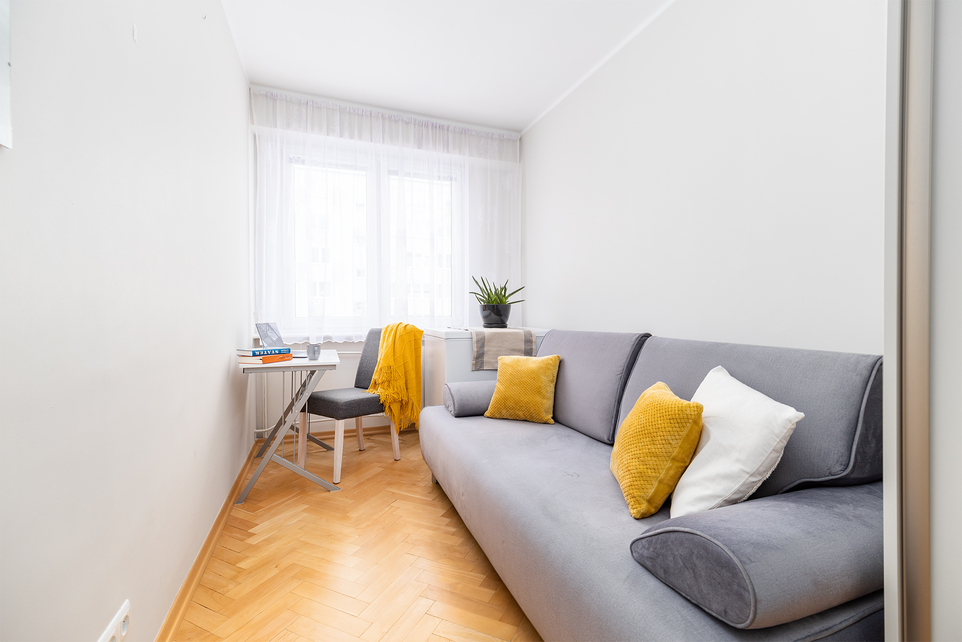 -Największy pokój (14.5 m2) pełni funkcję salonu. Jest ustawny i jasny, z wyjściem na mały balkon z ekspozycją zachodnią.