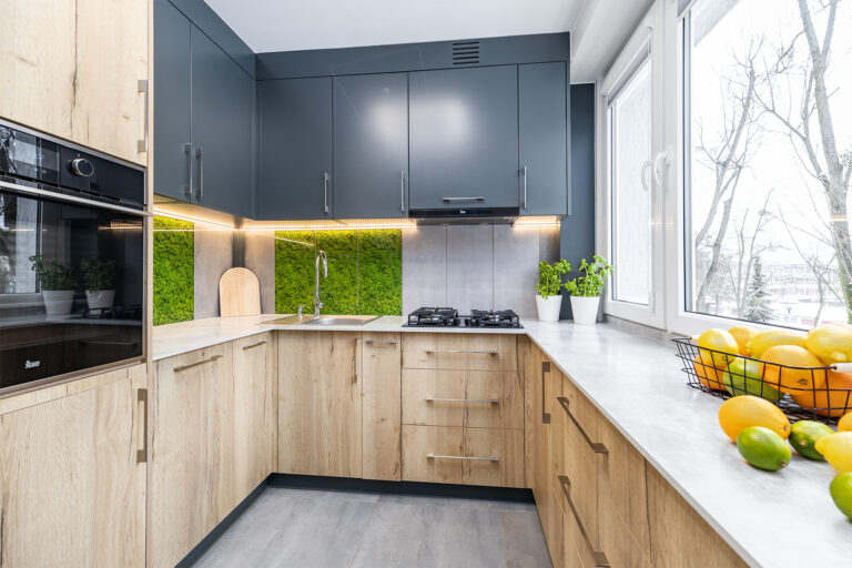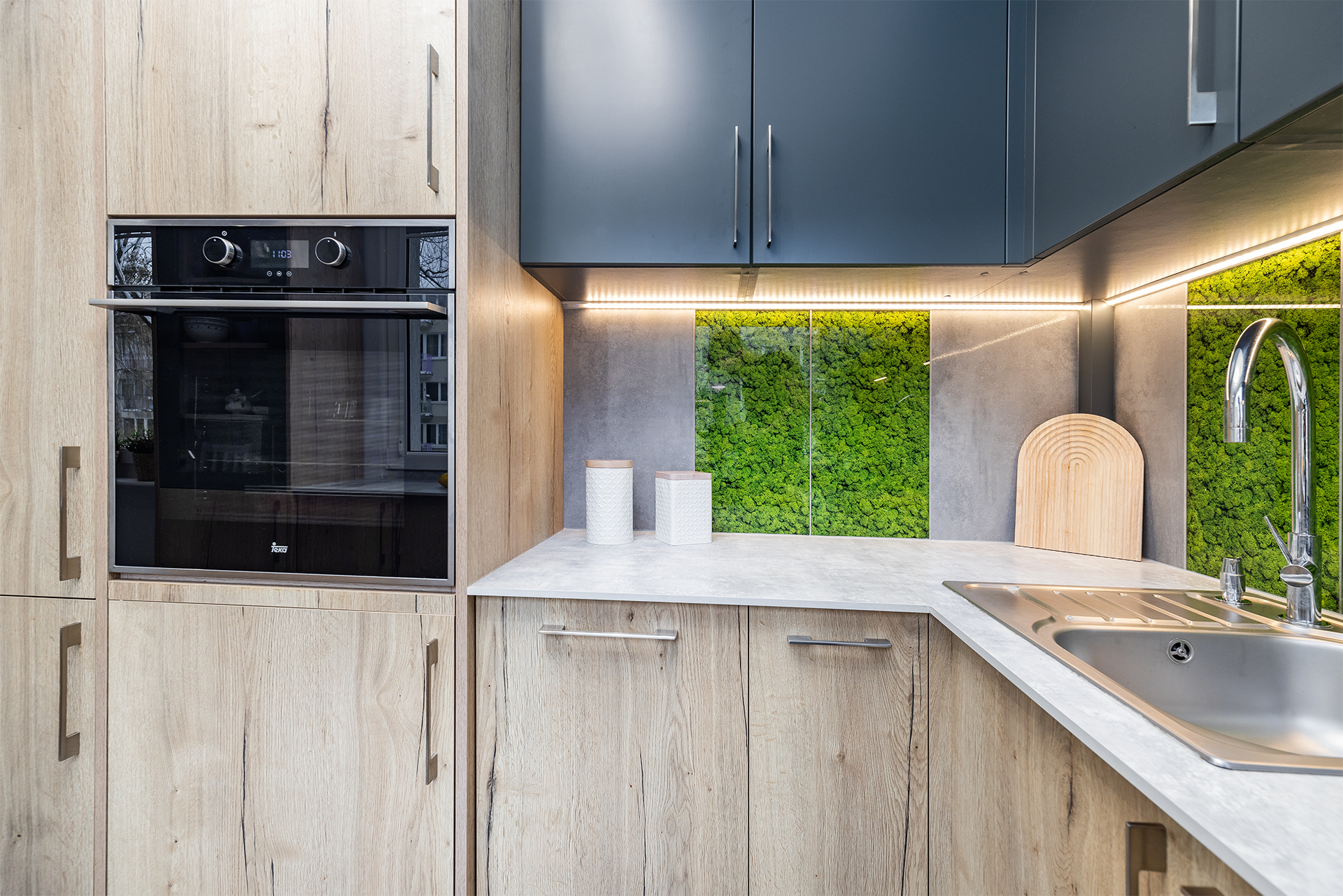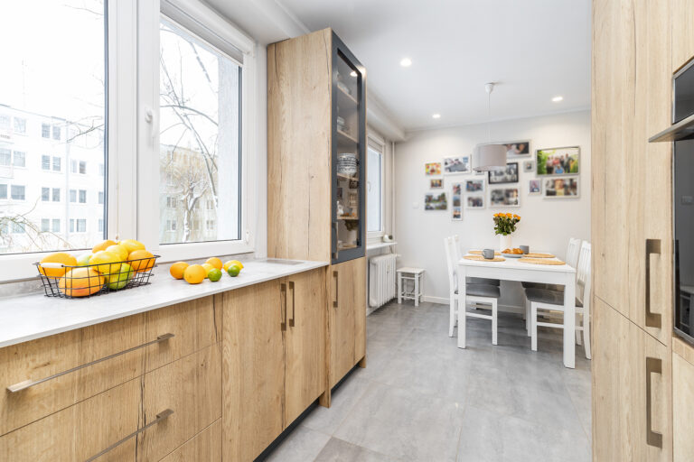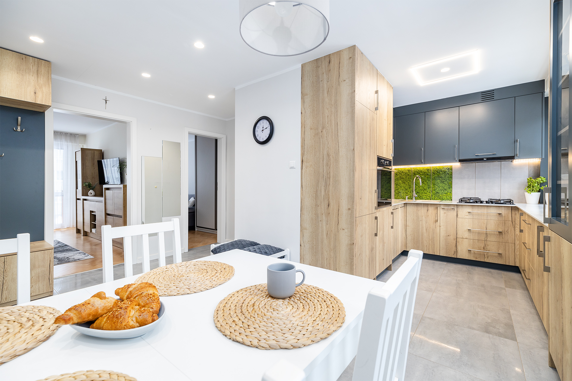 -Strefę dzienną tworzy duża jadalnia połączona z funkcjonalną kuchnią, wyposażoną w nowoczesną zabudowę meblową oraz kompletny sprzęt AGD: płytę gazową, piekarnik, okap, lodówkę i zmywarkę.