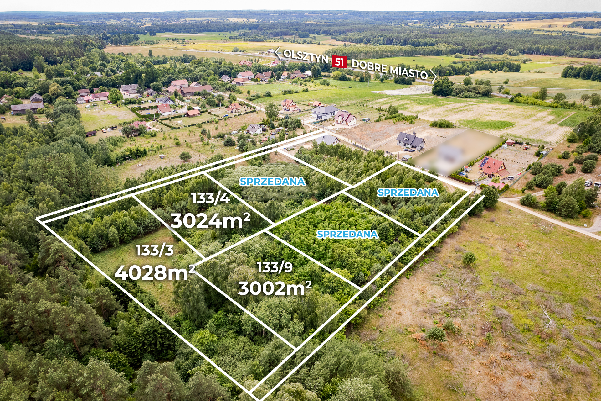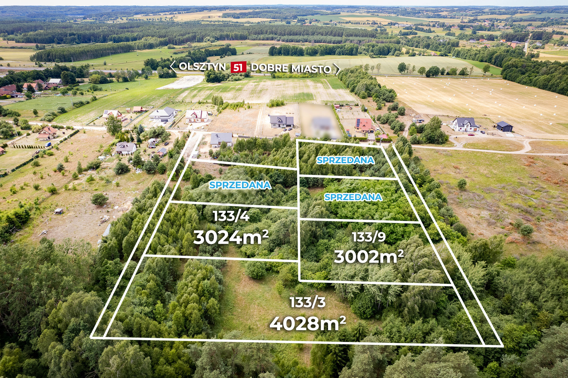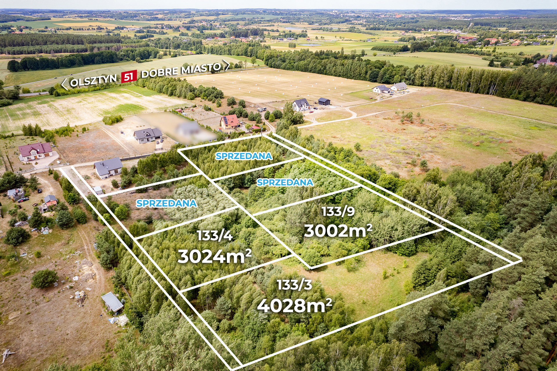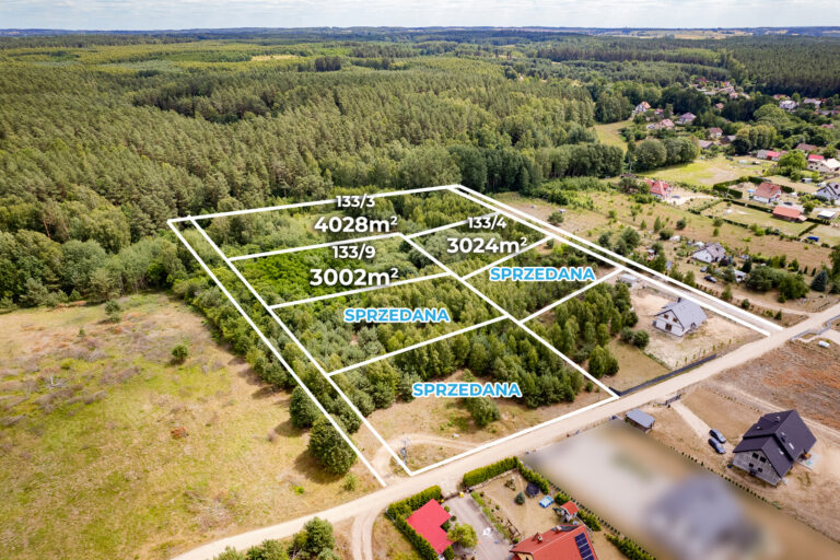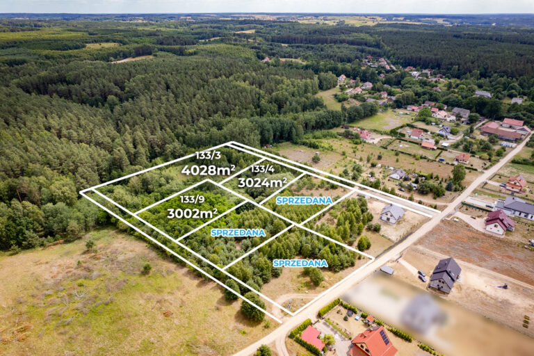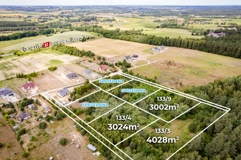 Oferujemy do sprzedaży działki w otoczeniu lasu, 6 km od centrum Dobrego Miasta.