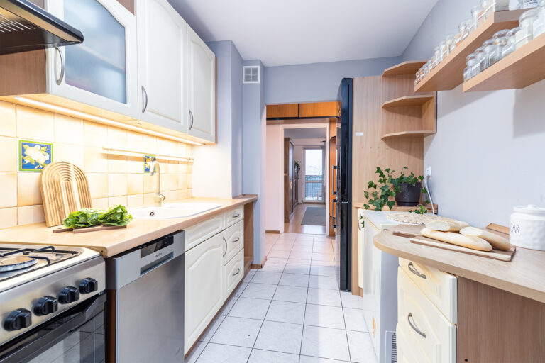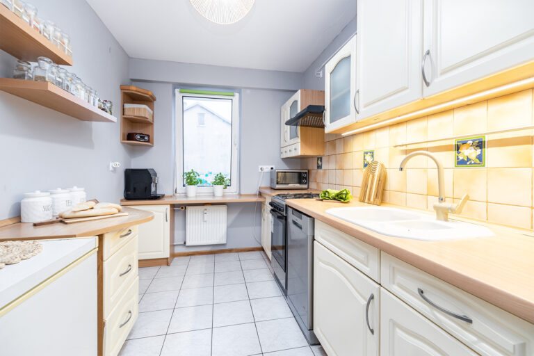 -Kuchnia z meblami w zabudowie i sprzętem AGD (kuchenka gazowa z piekarnikiem, okap, zmywarka, lodówka).